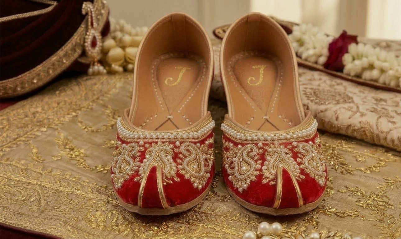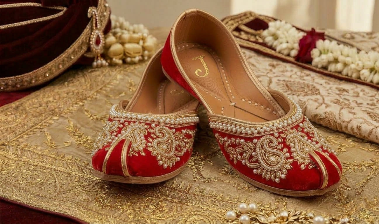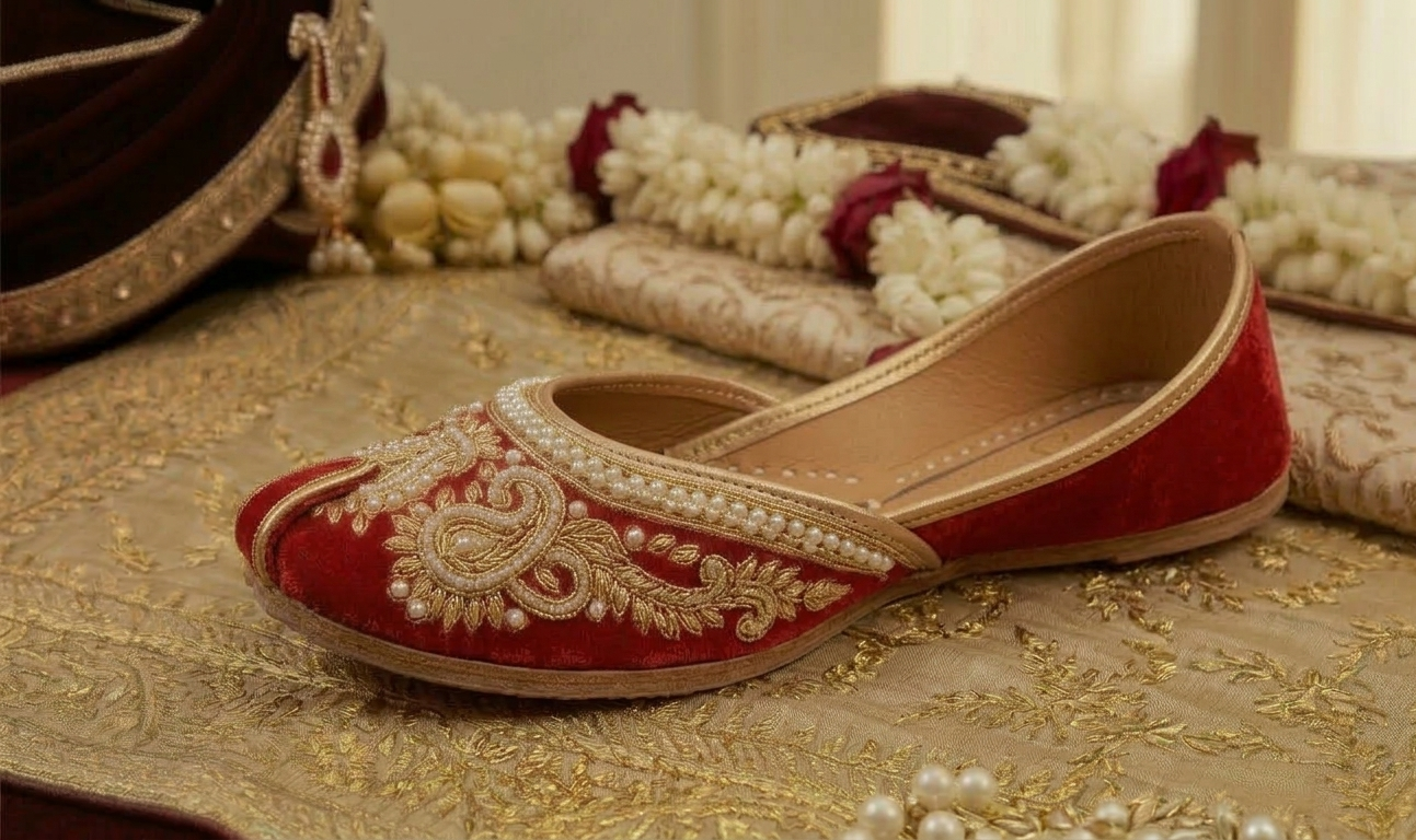 Traditional Indian juttis with intricate embroidery for festive occasions.